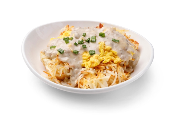 This is a true classic and a local favorite for anyone who comes hungry. Big Country starts with giant, flaky biscuits and golden hash browns, piled high with two hand-cracked eggs and smothered in house-made gravy and chives. It’s hearty, comforting, and exactly what many regulars picture when they think of a Scramblers breakfast.