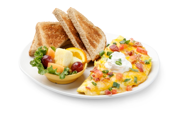For those who believe more is more, the Ultimate Omelette lives up to its name. This omlelette is packed with sausage, ham, bacon, bell peppers, zucchini, diced onions, portobello mushrooms, and tomatoes, then finished with a generous blend of hand-shredded Monterey Jack and yellow cheddar cheeses. Finally, a dollop of sour cream and chives on top brings it all together.