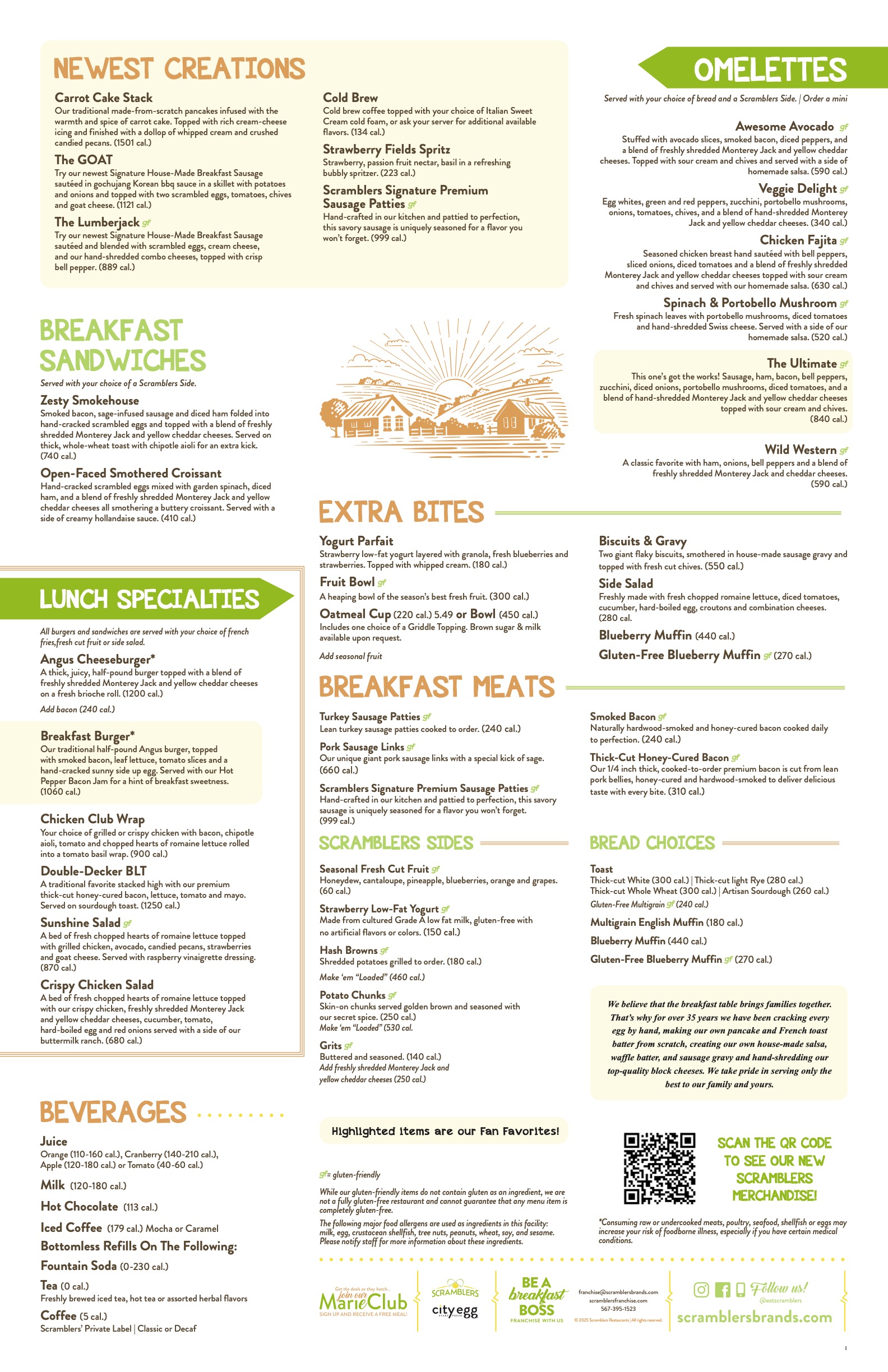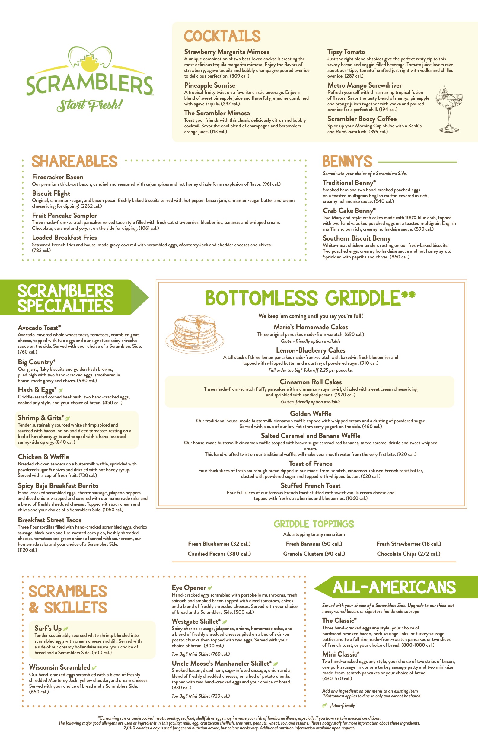 Delicious, made-to-order breakfast and lunch favorites served daily. Cocktails served at participating Scramblers locations only.